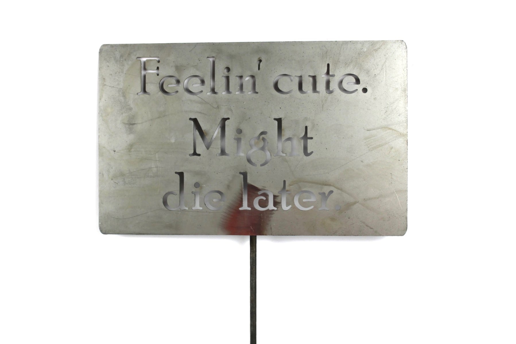 Feelin' cute. Might die later. rustic metal sign makes a great gift! Are your plants always on the brink of death? Let's own it and put a label on it! This metal stake is perfect for your overdramatic house plants, too. You can choose from a medium sign that fits into a flower pot or next to the door, up to an extra large sign that will not be missed!
